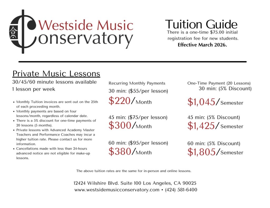 The Westside Music Conservatory offers private, semi-private (two students), and group (three or more students) lessons in the following classical instrument disciplines: piano, string, wind/brass, percussion, voice, and guitar. Complimentary consultations are available to ensure that you are matched with the instructor that best suits your learning style. Lessons are scheduled once or twice per week.