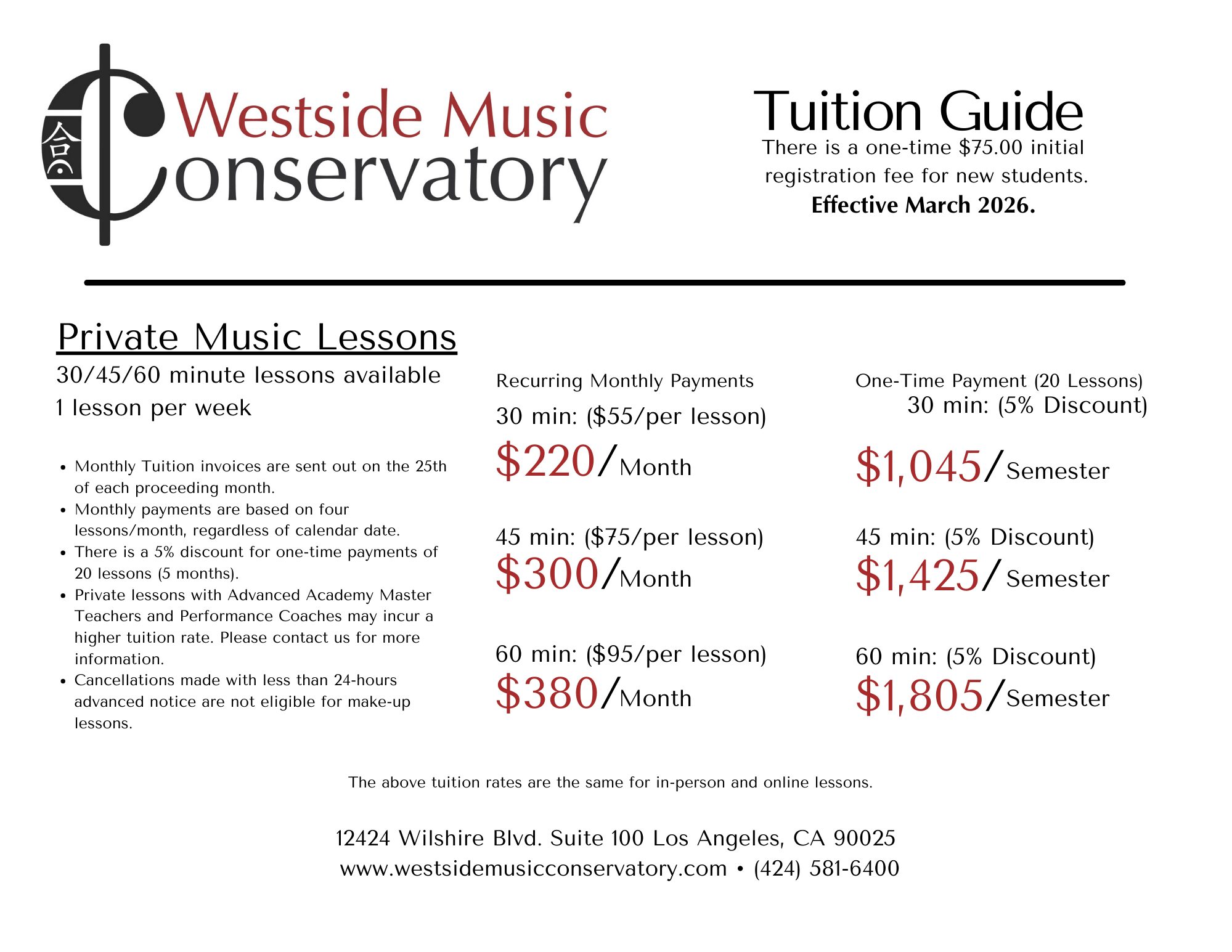 - There is a one-time $75.00 initial registration fee for new students.